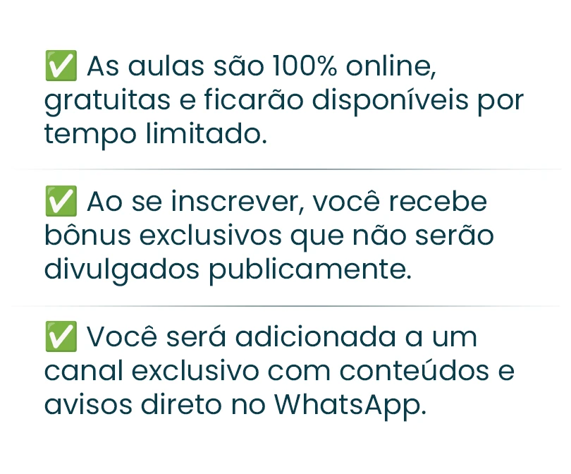 As aulas são gratuitas, mas o acesso aos bônus e ao canal exclusivo no WhatsApp é limitado.
